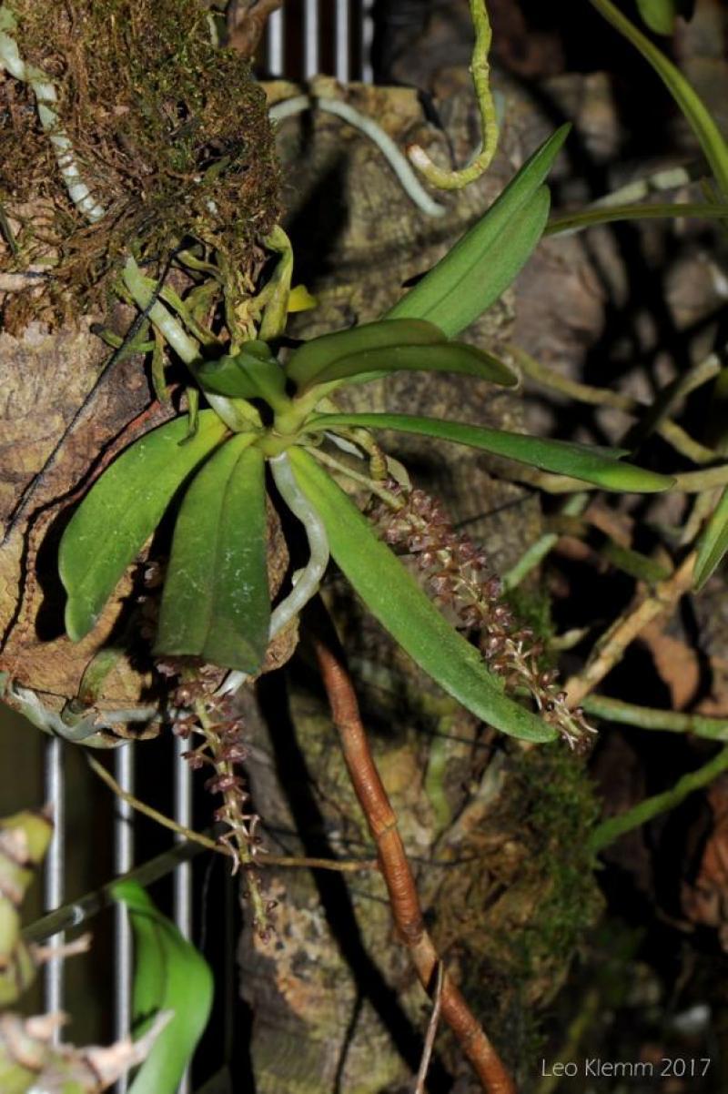 Monopodial. Each new growth has numerous leathery thick, lance shaped leaves