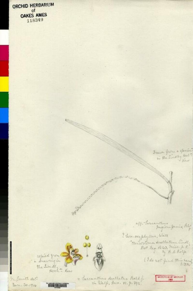 Sarcanthus dealbatus is a large warm to hot growing epiphytic orchid belonging to the sub family Epidendroideae.