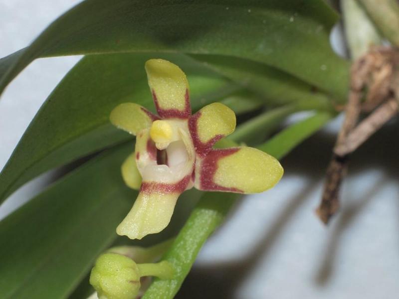 Monopodial. Grows to 3cm. Each new growth has numerous leaves that grow to 0.8-12cm long. The plant forms pendant or arching growths