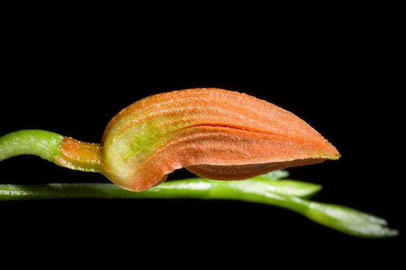 Grows to 12cm. Each new growth has a single leathery lance shaped leaf. Pseudobulbs grow to 1-2cm