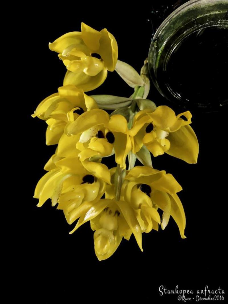 The Bent Stanhopea is a medium sized sympodial cool to warm growing epiphytic orchid belonging to the sub family Epidendroideae native to Ecuador.