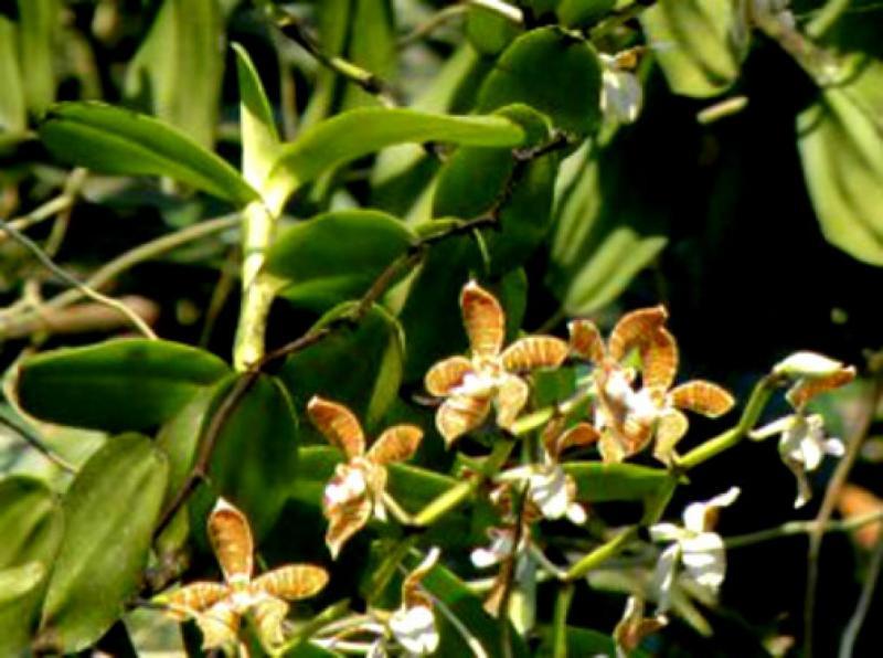 Monopodial. Grows to 75cm. Each new growth has numerous oblong shaped leaves that grow to 3-12cm long. The plant has a climbing growth habit